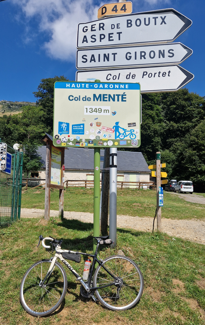 Le Col de Menté, par ce versant, c’est 11km et des pourcentages variables, débonnaires au début puis qui se durcissent au fil des innombrables lacets. La route est belle, le cheminement agréable à peine troublé par quelques motos et voitures. Je vois peu de cyclistes, 2 ou 3 qui me dépassent, un groupe, loin en contrebas. Mais où sont-ils tous ? Je vais vite le découvrir en arrivant au col, où du ravitaillement prévu, il ne reste plus que la pancarte. Le gros des participants est déjà passé depuis un moment et, victime de ce succès, le point ravito n’a pas résisté. Qu’importe, je me lance dans la descente qui fait chauffer les freins, vers St-Béat, avec en tête les avertissements d’un cycliste sur toute une section de route en gravillon.