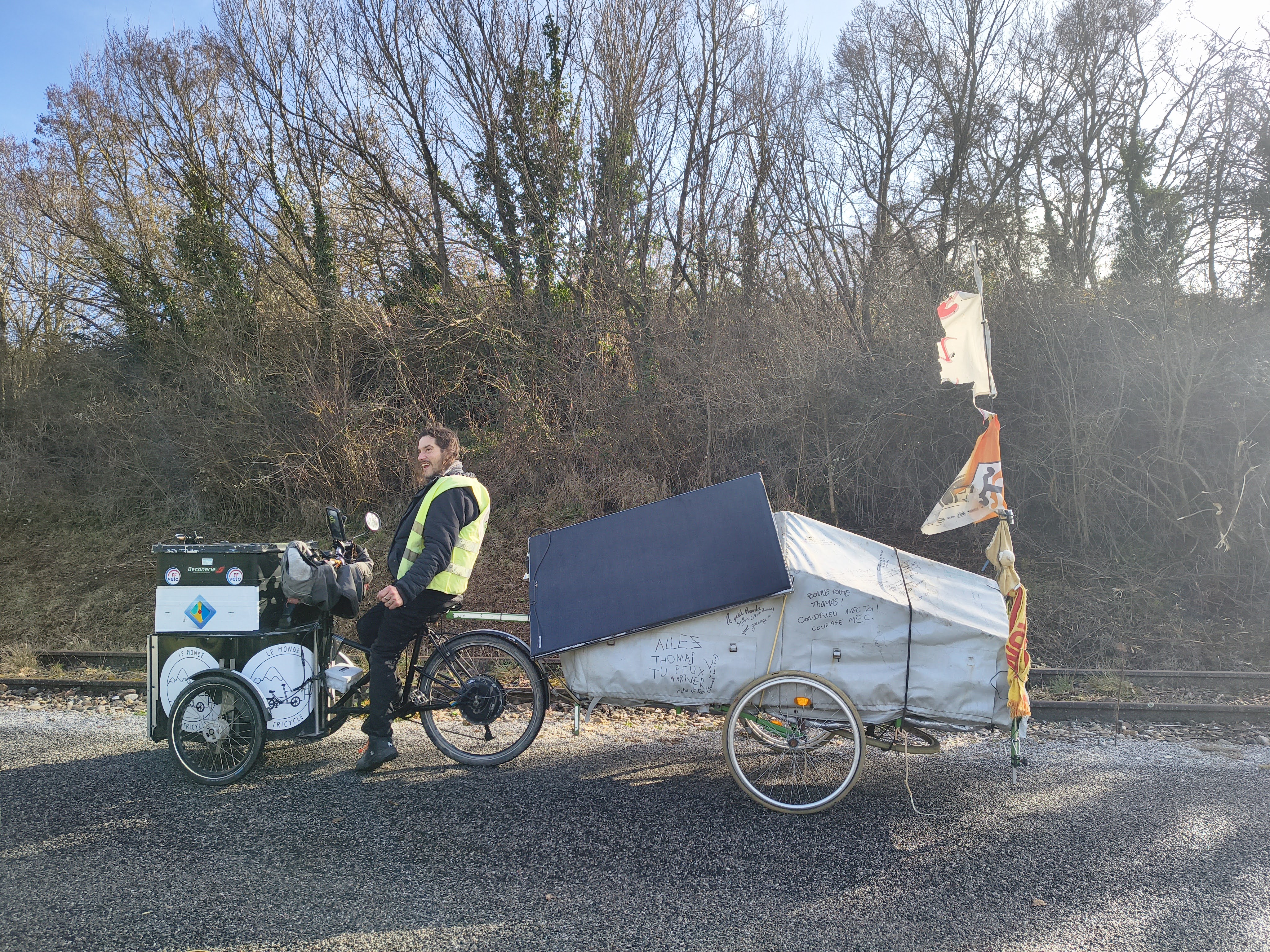 Ce sont de belles rencontres, ce couple de retraités qui nous offre l’abri de leur auvent et 2 grands mugs d’un excellent café, le temps de réparer une crevaison ; Thomas notre livreur de vêtements, croisé dans le Val de Sioule en route sur son tricycle pour Lens et ses corons ;