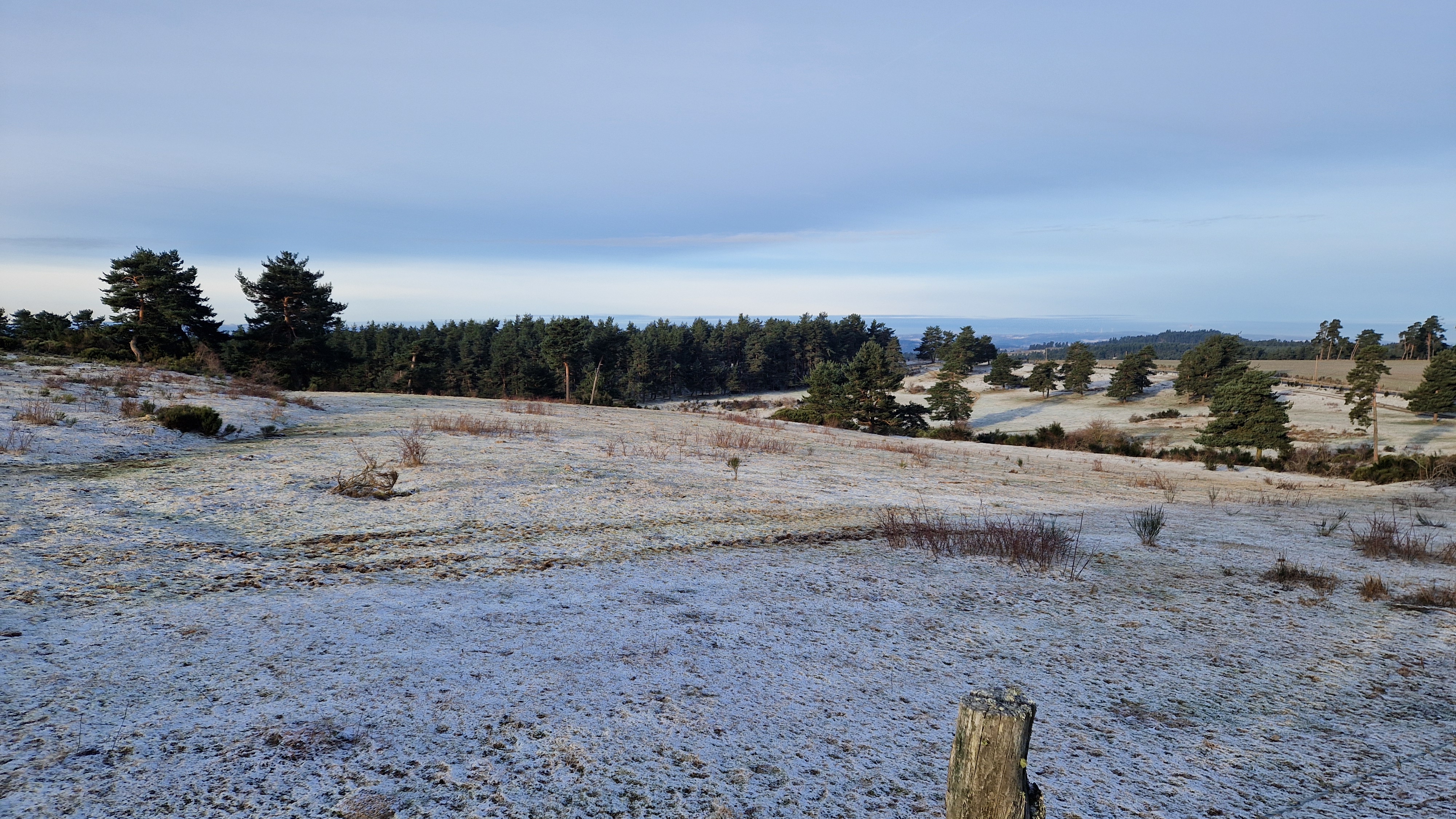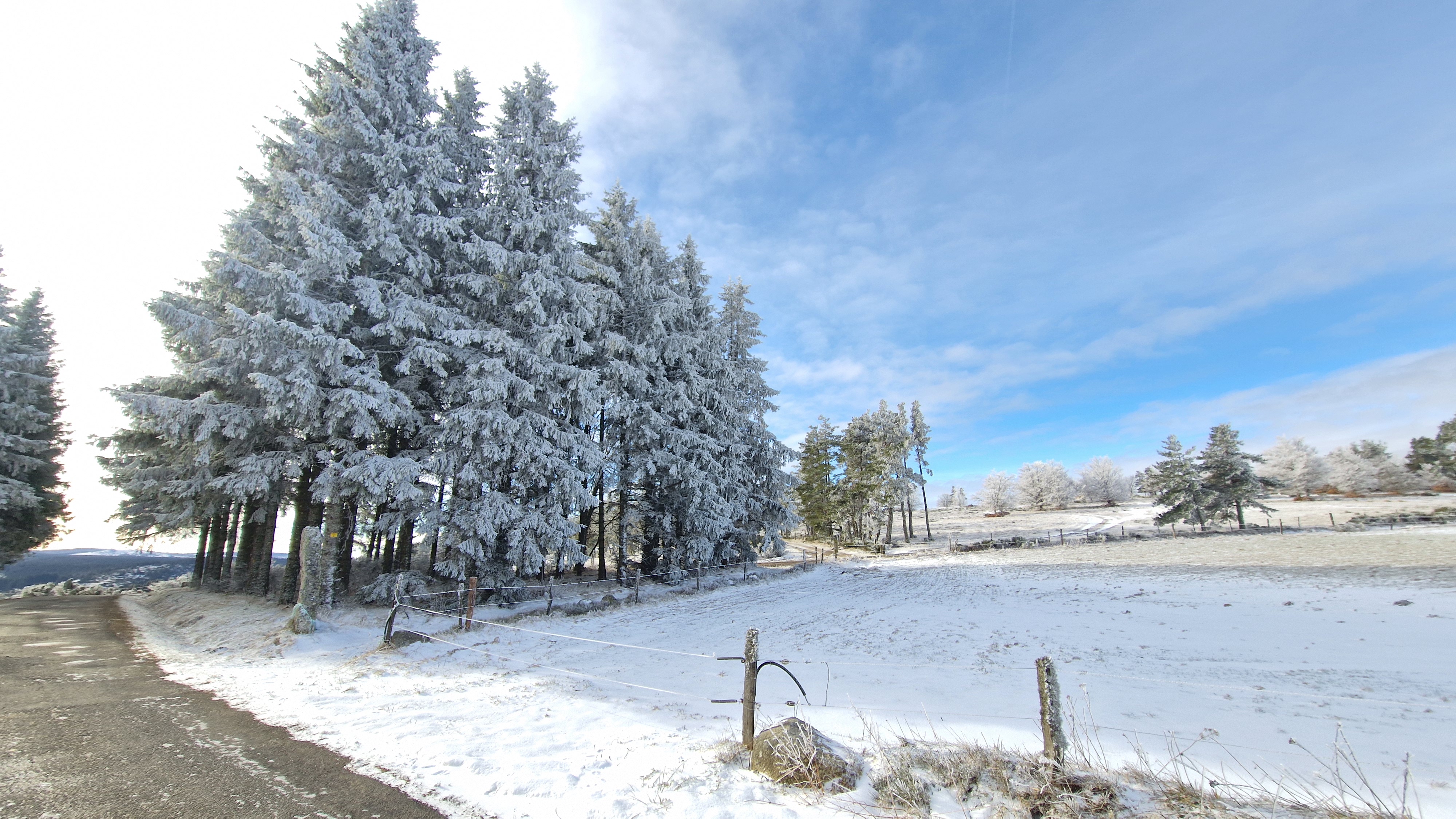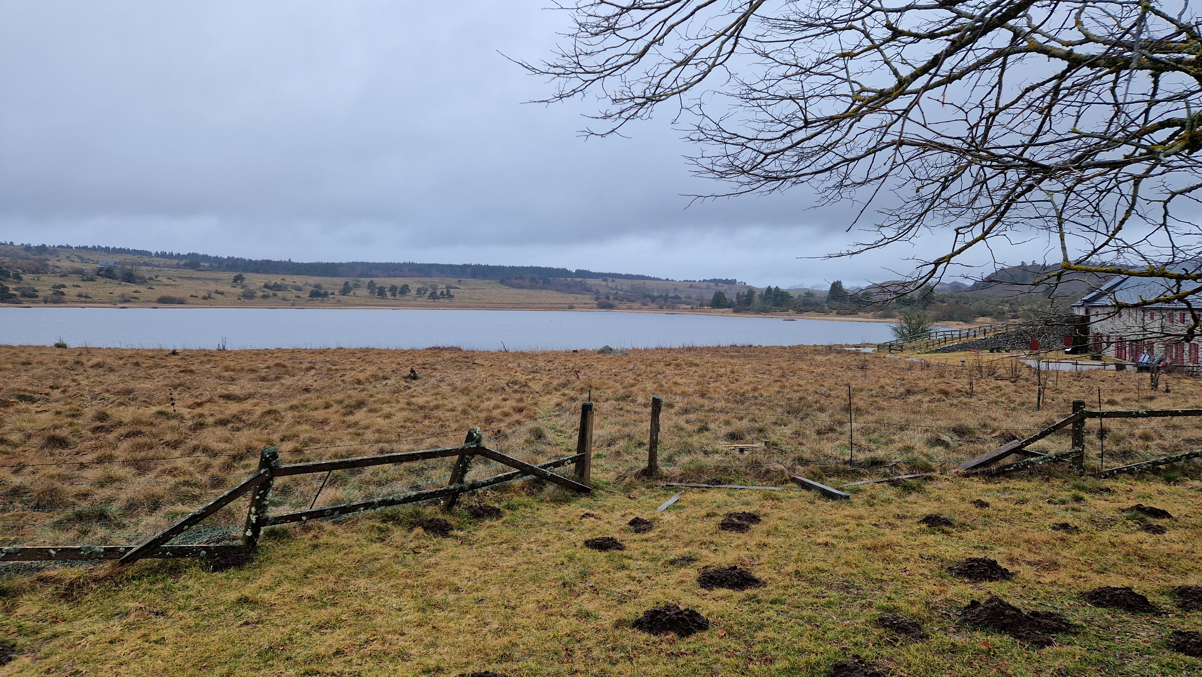 La nature est belle, rude, sauvage, le froid se fait mordant, on traverse le vide, mais on n’est pas seul. Un vol de grues juste au-dessus de nos têtes salue d’un grand V notre arrivée au col de Combalut. Là, les petits doigts d’une loutre sur les berges inondées de l’Allagnon. A-t-elle réussi à se saisir d’un saumon ? Ici, un gros gibier a laissé son empreinte dans la boue du chemin, là encore, ce renard divagant qui a parsemé la neige de petits trèfles à 4 feuilles. Et de loin en loin, de robustes chevaux qui nous regardent passer ou ce troupeau de vaches Aubrac accompagné de son splendide taureau qui arpente l’herbage de son pas martial.